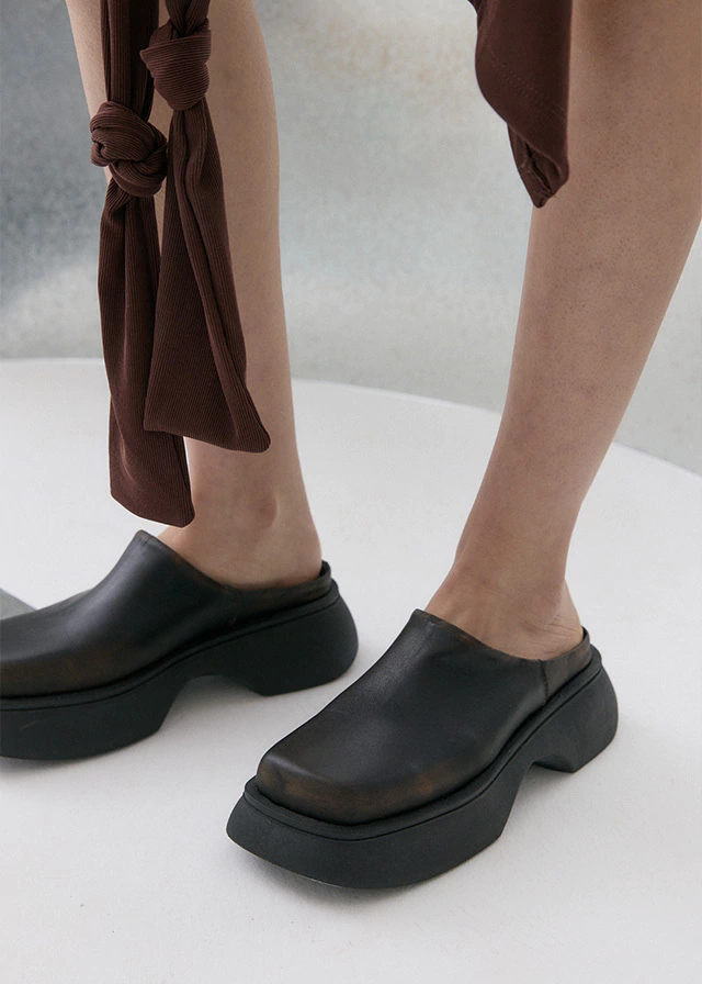 Zueco con capellada cerrada realizada en cuero gastado. Posee base negra con altura.